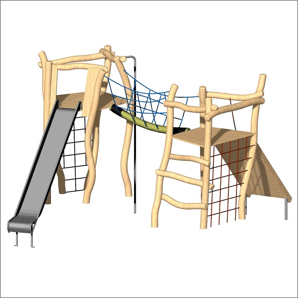 Der Spielturm bietet Kindern ein abwechslungsreiches und spannendes Spielerlebnis in luftiger Höhe. Zwei Podeste sind über eine Tampenbrücke miteinander verbunden – ein echtes Highlight, das Mut, Gleichgewicht und Koordination fördert und gleichzeitig jede Menge Abenteuer verspricht.